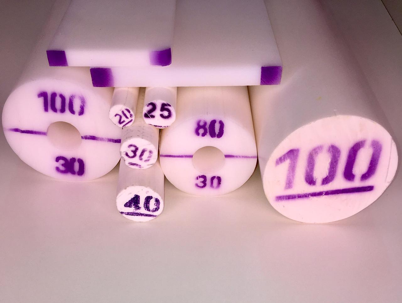 Os tarugos, chapas e tubos de PBT MGS são identificados pela pintura de números na cor violeta na ponta da peça que indicam a medida em milímetros das mesmas.
